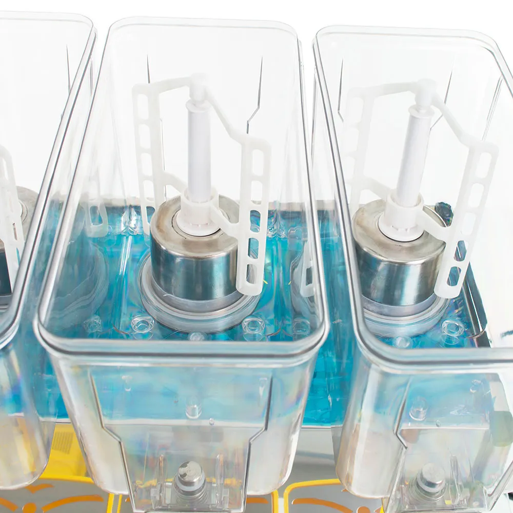 Количество емкостей: 3; объем каждой емкости: 12 л; температурный режим: +7...+12 °C; хладагент: R134A; перемешивание: погружной насос; материал корпуса: нержавеющая сталь 430; материал контейнера: поликарбонат.