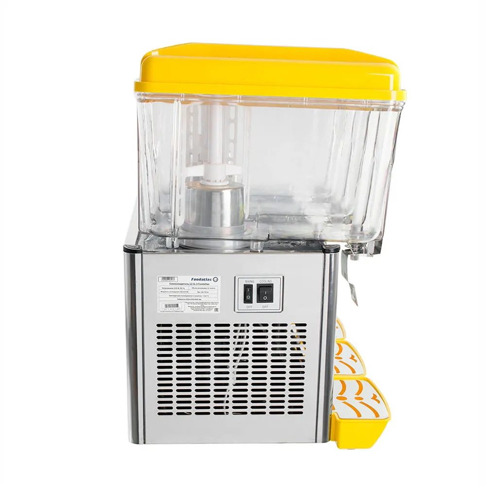 Сокоохладитель Foodatlas 12 PL-3 предназначен для эффективного охлаждения и дозированной подачи различных напитков, таких как соки, морсы и молочные коктейли. Оснащенный тремя прозрачными контейнерами объемом по 12 литров каждый, он позволяет одновременно предлагать клиентам несколько видов охлажденных напитков. Корпус устройства выполнен из нержавеющей стали 430, обеспечивая долговечность и соответствие санитарным нормам. Прозрачные контейнеры из поликарбоната позволяют визуально контролировать уровень напитков и привлекают внимание покупателей.