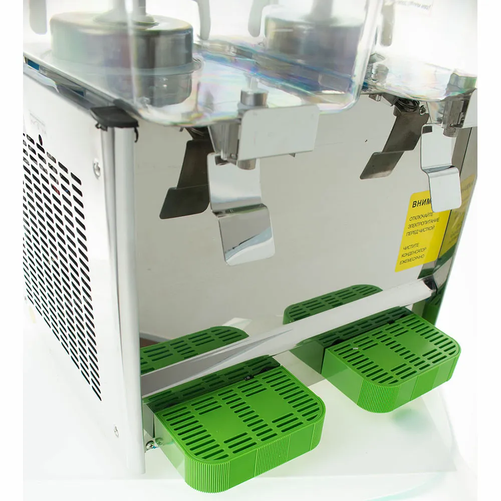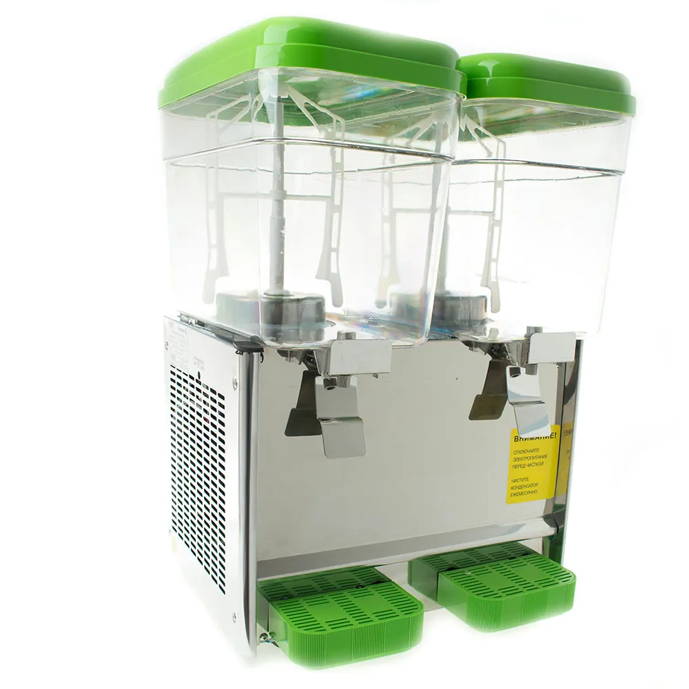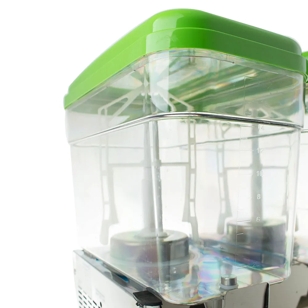 Объем резервуара: 18 л; количество резервуаров: 2; диапазон температур охлаждения: 7–12 °C; хладагент: R134A; тип перемешивания: лопастной вентилятор; материал корпуса: нержавеющая сталь 430; материал контейнера: поликарбонат.