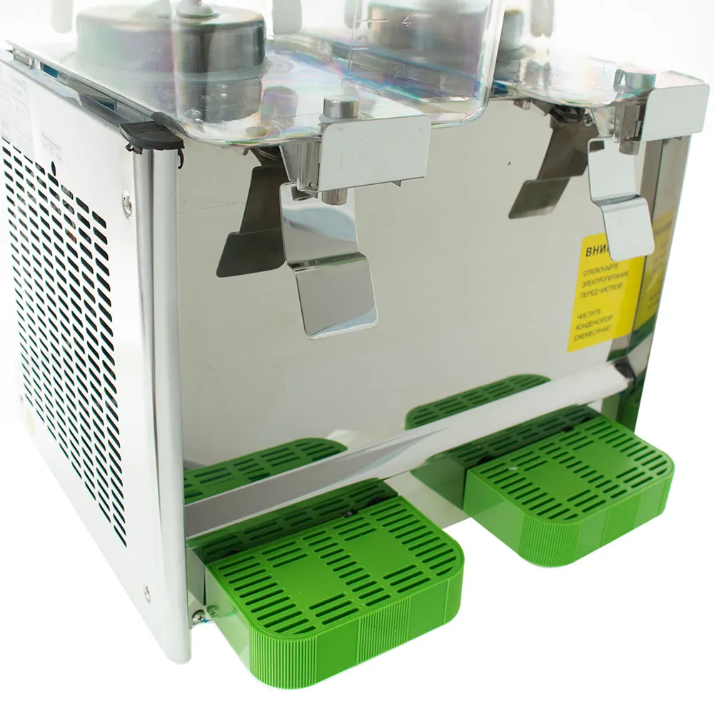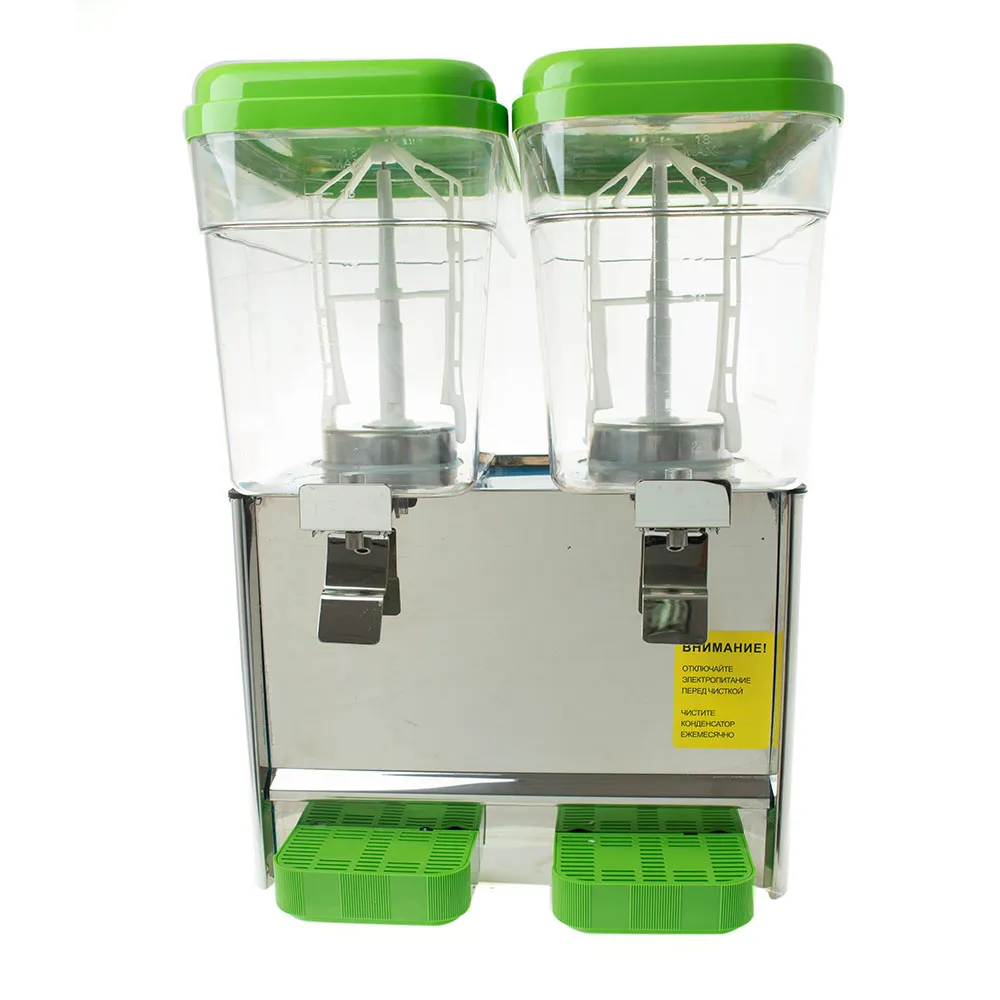 Сокоохладитель Foodatlas JA18-2 предназначен для эффективного охлаждения и дозированной подачи различных напитков, включая фруктовые соки, морсы и молочные коктейли. Благодаря двум резервуарам объемом по 18 литров каждый, общая вместимость устройства составляет 36 литров, что позволяет обслуживать значительное количество клиентов без частого пополнения. Температурный диапазон охлаждения от 7 до 12 °C обеспечивает оптимальную прохладу напитков, сохраняя их вкусовые качества. Использование хладагента R134A гарантирует эффективную и экологически безопасную работу устройства. Лопастной вентилятор обеспечивает равномерное перемешивание содержимого, предотвращая оседание частиц и обеспечивая однородность напитков. Корпус из нержавеющей стали 430 обеспечивает долговечность и устойчивость к коррозии, а прозрачные контейнеры из поликарбоната позволяют контролировать уровень жидкости и привлекают внимание клиентов.