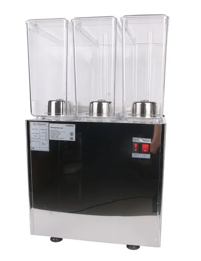 Сокоохладитель с тремя емкостями по 9 литров предназначен для хранения и дозированной подачи охлажденных напитков. Прозрачные поликарбонатные емкости обеспечивают визуальный контроль содержимого, а корпус из нержавеющей стали AISI 304 гарантирует долговечность и устойчивость к коррозии. Термостат позволяет регулировать температуру в диапазоне от 7 до 12 °C, обеспечивая оптимальные условия для различных напитков. Специальные краны оснащены защитой от случайного открывания и протекания, а съемный каплесборник упрощает процесс очистки. Холодильный агрегат с воздушным охлаждением конденсатора и использование хладагента R404a с 2020 года обеспечивают эффективное и экологичное охлаждение.