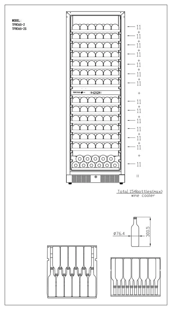 - Общий объём: 416 литров (350 литров полезного объёма), вмещает до 163 бутылок объёмом 750 мл.