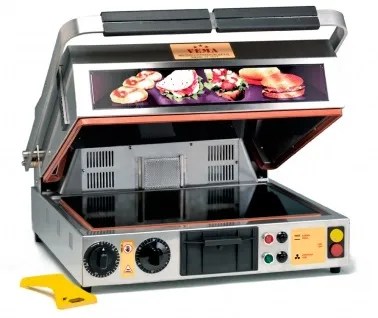 Гриль-печь Vema PF 2095 — высокопроизводительное устройство контактного типа с керамическими нагревательными элементами, разработанное для профессионального использования на кухнях ресторанов, кафе, пиццерий и точек быстрого питания. Аппарат сочетает функции гриля и печи — верхняя нагревательная плита может регулироваться по положению, превращая устройство в духовой шкаф с вентиляцией, что расширяет спектр кулинарных задач. Стеклокерамическая рабочая поверхность обеспечивает равномерный прогрев, не выделяет дым и легко очищается, а корпус из нержавеющей стали гарантирует долговечность и соответствие нормам гигиены.