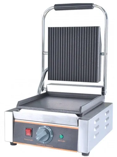 Данный прижимной гриль представляет собой однозонное контактное устройство, разработанное для интенсивного использования в коммерческих кухнях. Он сочетает в себе простоту конструкции, функциональность и надёжность. Аппарат оборудован верхней рифлёной и нижней гладкой жарочными поверхностями из литой стали, что обеспечивает качественную прожарку и минимальное прилипание продуктов. Температура регулируется механическим термостатом, дающим оператору точный контроль над тепловым режимом. Корпус выполнен из нержавеющей стали, панели легко очищаются, а съёмные элементы упрощают обслуживание. Благодаря этому гриль подходит для работы с широким спектром продуктов, обеспечивая стабильный результат при высокой нагрузке.
