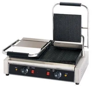 - Двойная верхняя прижимная пластина: обеспечивает равномерный прогрев продуктов с обеих сторон, ускоряя процесс приготовления.