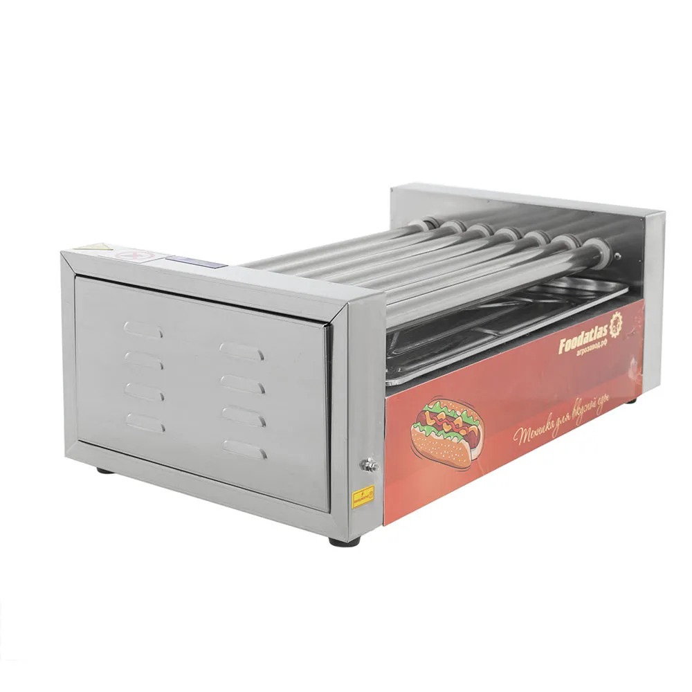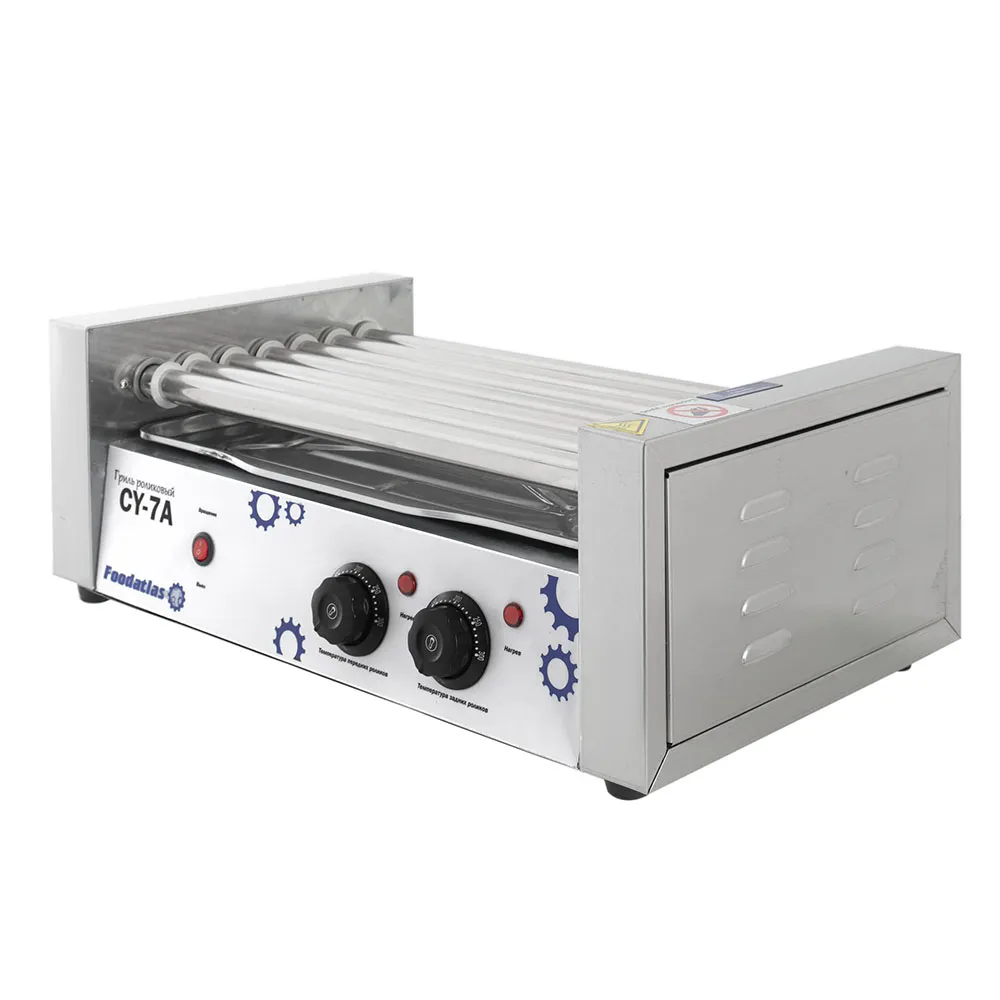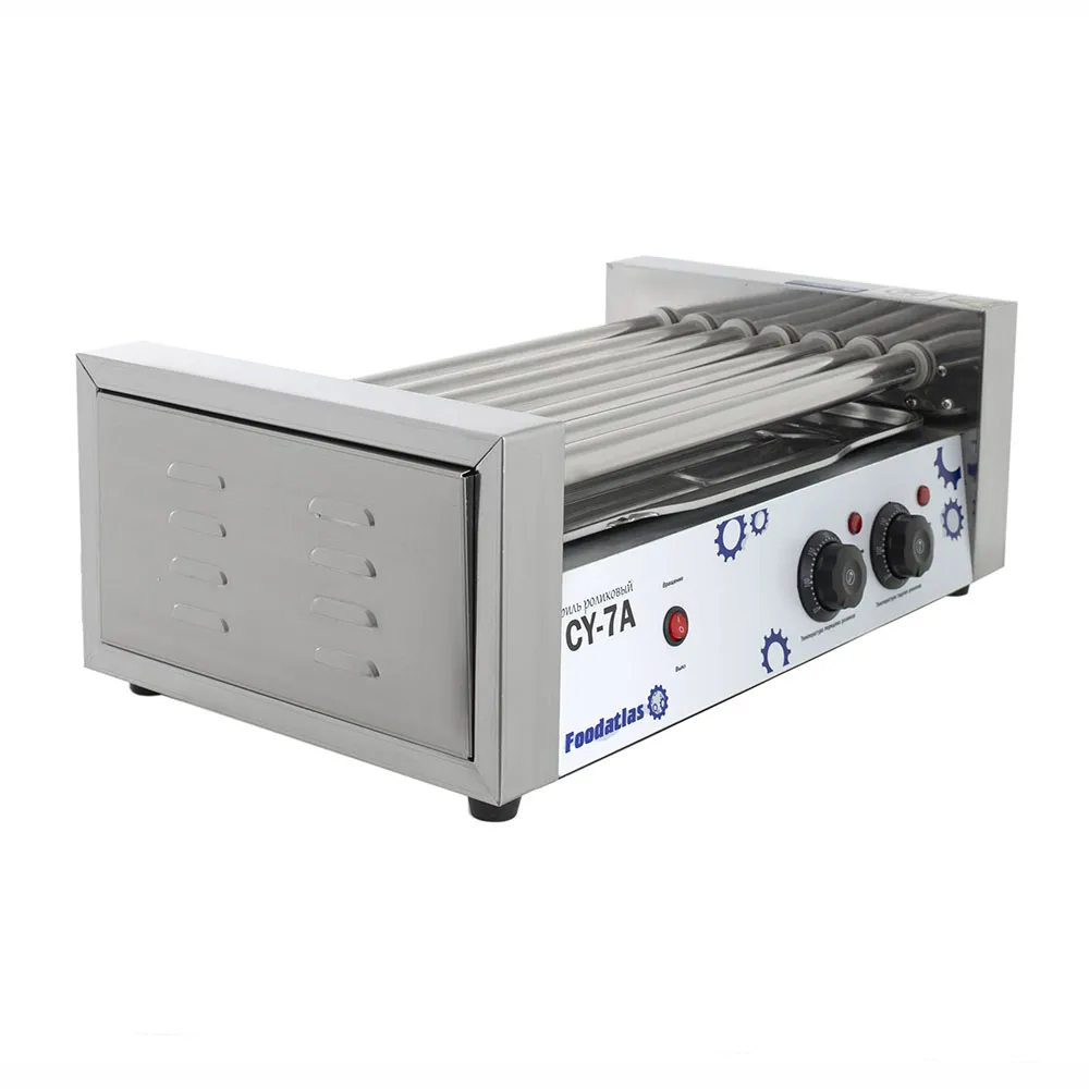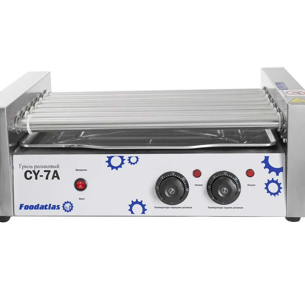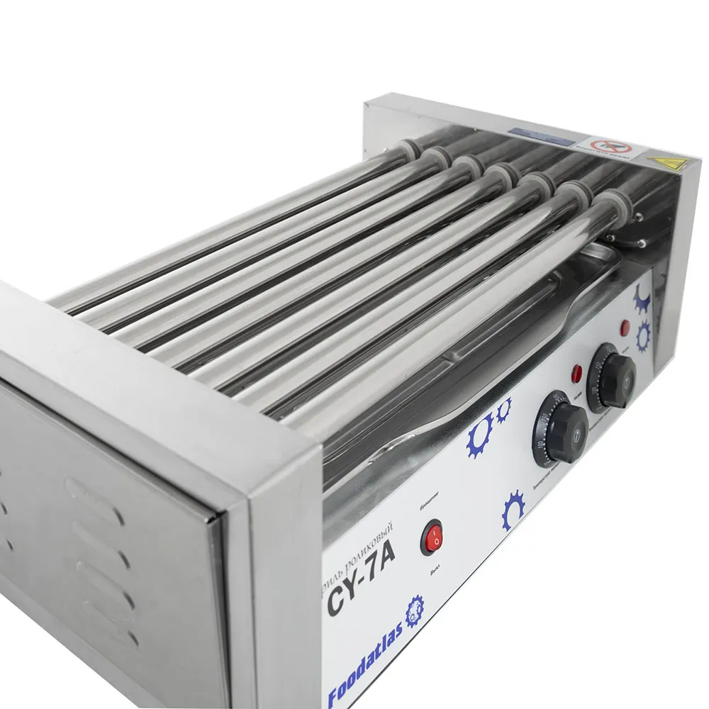 Роликовый гриль предназначен для эффективного и равномерного обжаривания сосисок, сарделек и колбасок на предприятиях общественного питания и торговли. Оснащён семью роликами длиной 470 мм и диаметром 25 мм, расположенными с интервалом 10 мм, что обеспечивает оптимальное размещение продуктов и равномерное их приготовление.