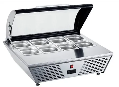 В комплекте поставки 8 гастроемкостей GN1/6 глубиной 100 мм из нержавеющей стали AISI201 без крышек.