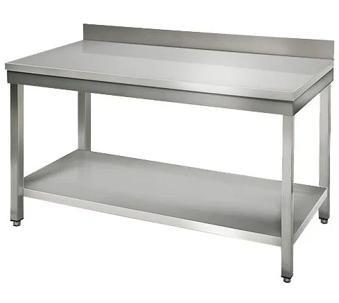 Рабочая поверхность стола выполнена из нержавеющей стали AISI 304 толщиной 1 мм, обеспечивающей долговечность, устойчивость к коррозии и простоту ухода. Она дополнительно усилена вкладкой из ламинированной ДСП, что повышает жесткость и надежность конструкции. Каркас и нижняя полка изготовлены из нержавеющей стали AISI 201, обеспечивая устойчивость и защиту от воздействия влаги и химических моющих средств.