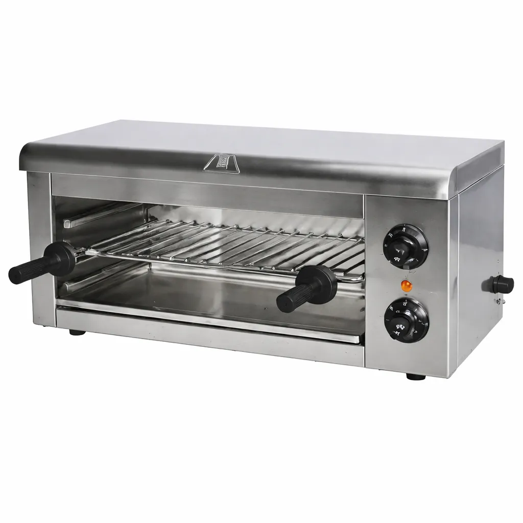 Профессиональный гриль-саламандра предназначен для быстрого запекания, подрумянивания и доведения блюд до готовности на предприятиях общественного питания. Нагрев осуществляется верхними ТЭНами, благодаря чему продукт не контактирует с нагретой поверхностью и равномерно обрабатывается инфракрасным теплом. Модель оснащена регулируемой по высоте решеткой, что позволяет точно контролировать интенсивность теплового воздействия и получать стабильный результат при высокой загрузке кухни.