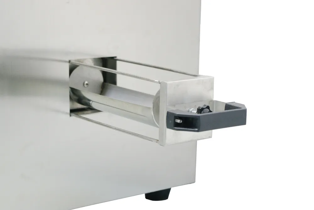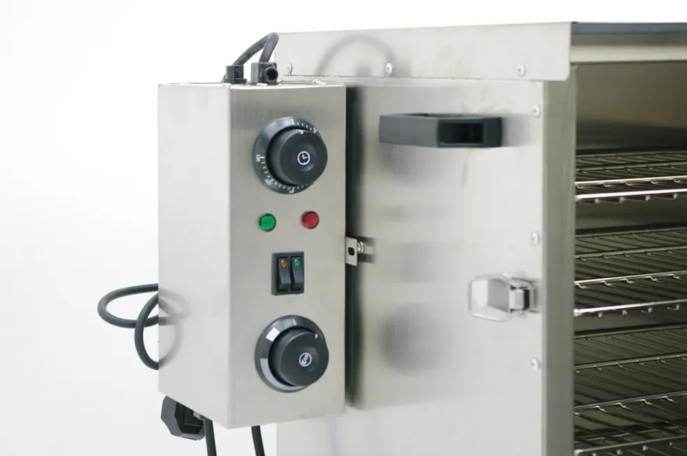 Модель оснащена механической панелью управления на боковой стороне, позволяющей легко регулировать температуру и время копчения до 120 минут. Герметичная дверная прокладка из силикона обеспечивает минимальные потери тепла и сохранность аромата продуктов внутри камеры.