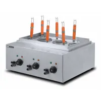 Корпус макароноварки выполнен из высококачественной нержавеющей стали, обеспечивая надежность, долговечность и легкость в уходе. В комплект поставки входят крышка для сохранения тепла и шесть цилиндрических корзин объемом 1,8 л каждая, что обеспечивает возможность приготовления большого количества продукции за один цикл работы.