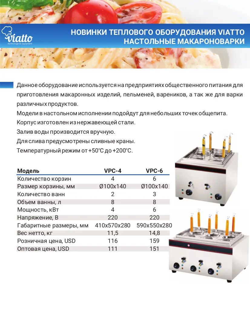 VIATTO VPC-6 представляет собой идеальное решение для предприятий, где важны быстрота приготовления, сохранение вкусовых качеств продуктов и надежность оборудования.