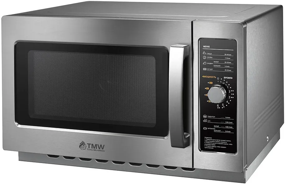 Профессиональная микроволновая печь с объемом рабочей камеры 25 литров предназначена для интенсивной эксплуатации в условиях предприятий общественного питания. Модель оснащена магнетроном мощностью 1000 Вт и электромеханической системой управления, обеспечивающей надежность и простоту в использовании даже при высокой нагрузке. Таймер позволяет устанавливать время работы до 30 минут, а пять уровней регулировки мощности дают гибкость при выполнении различных задач — от бережного размораживания до интенсивного разогрева. Внутренняя камера и корпус выполнены из нержавеющей стали, устойчивой к коррозии, влаге и агрессивным моющим средствам. Поворотное стеклянное блюдо диаметром 292 мм способствует равномерному распределению микроволн, исключая появление холодных зон. Конструкция рассчитана на до 200 циклов нагрева в сутки, что подтверждает её соответствие требованиям коммерческой эксплуатации.