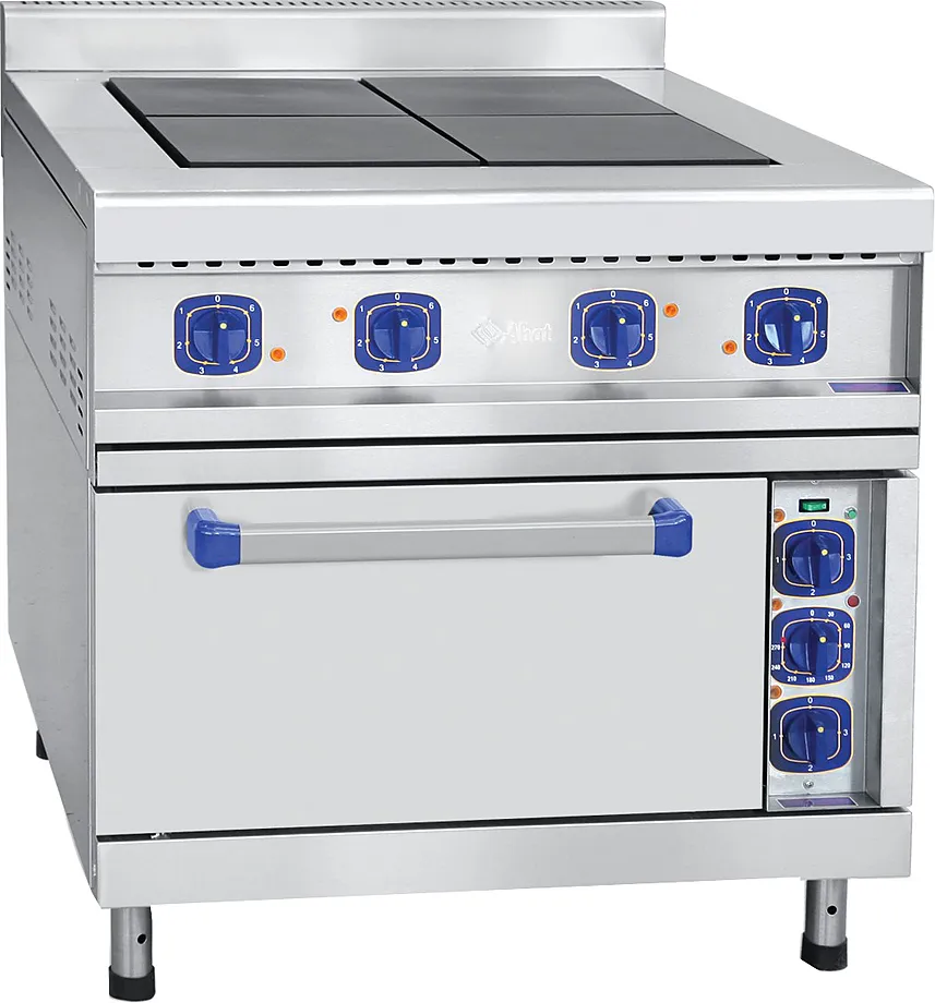 Профессиональная электрическая плита с комбинированной компоновкой, разработанная для интенсивного использования на коммерческих кухнях. Модель оснащена четырьмя чугунными конфорками и вместительным жарочным шкафом, совместимым с контейнерами стандарта GN 2/1. Такая конфигурация позволяет одновременно выполнять варку, жарку и запекание, обеспечивая высокую производительность и технологическую гибкость. Корпус и рабочие поверхности выполнены из нержавеющей стали, что гарантирует долговечность, устойчивость к коррозии и соответствие санитарно-гигиеническим нормам предприятий общественного питания.