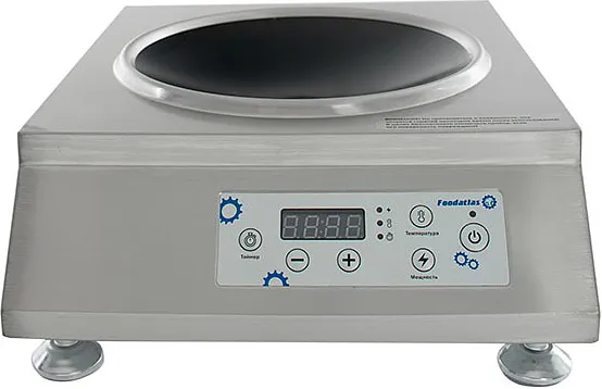 Профессиональная индукционная плита серии WOK, разработанная для интенсивного использования в коммерческих кухнях с акцентом на азиатскую кухню и высокотемпературные методы приготовления. Оборудование реализует технологию электромагнитной индукции, обеспечивающую мгновенный и равномерный нагрев дна посуды без нагрева окружающей поверхности. Конструкция оптимизирована для работы с широкоформатной WOK-посудой, включая модели с плоским и слегка выпуклым дном. Управление осуществляется через сенсорную панель с цифровым дисплеем, что позволяет точно задавать температуру, мощность и время работы.