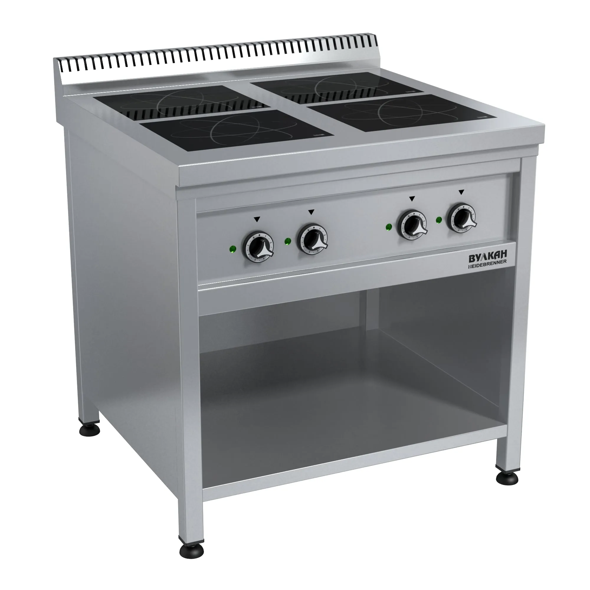 Особенности- Четыре независимые зоны нагрева, каждая мощностью 5 кВт, что позволяет готовить одновременно на четырёх конфорках.