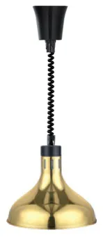 Подвесная тепловая лампа формирует равномерное инфракрасное излучение для поддержания температуры готовых блюд на профессиональных линиях раздачи. Специальная форма плафона с внутренним рефлектором обеспечивает направленный тепловой поток круглой конфигурации, охватывающий оптимальную рабочую зону без рассеивания энергии. Корпус из нержавеющей стали с золотистым покрытием сочетает повышенную коррозионную стойкость и эстетическую привлекательность для открытых зон обслуживания.