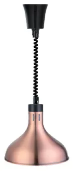 Подвесная инфракрасная лампа создает направленный тепловой поток для равномерного поддержания температуры готовых блюд на линиях раздачи общепита. Форма плафона с рефлектором обеспечивает концентрацию излучения в зоне заданного диаметра, исключая рассеивание энергии по периметру. Корпус из нержавеющей стали с медным покрытием сочетает высокую стойкость к коррозии и выразительный дизайн для премиальных интерьеров обслуживания.