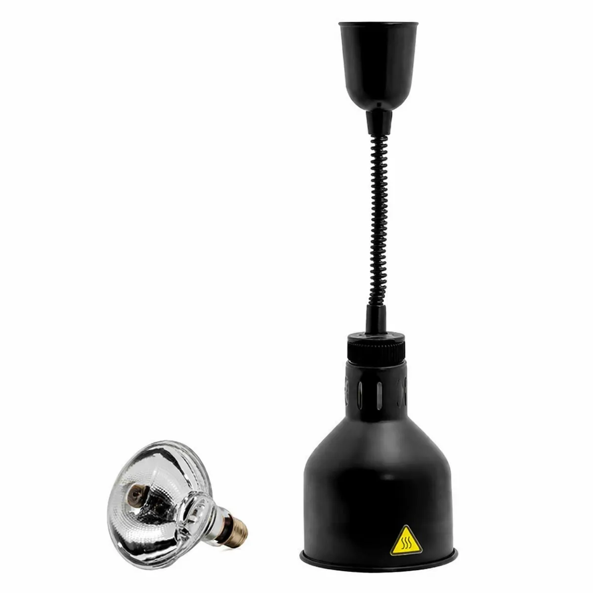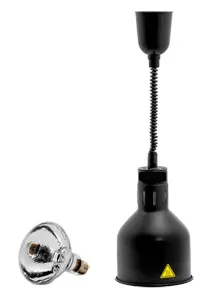 Подвесная лампа обеспечивает равномерный инфракрасный нагрев готовых блюд, поддерживая их температуру подачи на профессиональных линиях раздачи. Конструкция с механизмом регулировки высоты позволяет точно настроить расстояние от плафона до поверхности, минимизируя риск пересушивания продуктов. Корпус черного цвета сочетает прочность окрашенного металла с эстетической гармонией интерьера кухни или зала обслуживания.