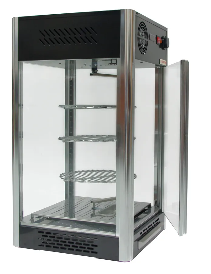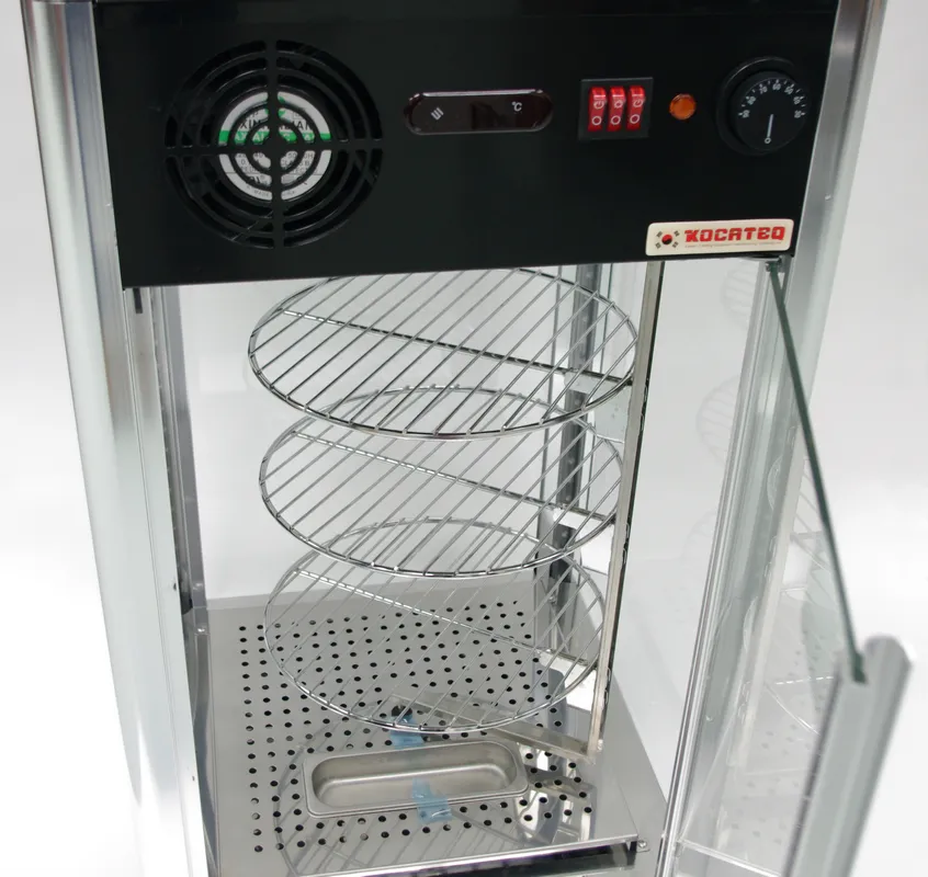Используется в барах, кафе, магазинах и столовых для демонстрации и поддержания температуры горячих блюд и выпечки, сохраняя свежесть и привлекательный внешний вид продуктов для покупателей. Вращающиеся полки обеспечивают равномерное прогревание.