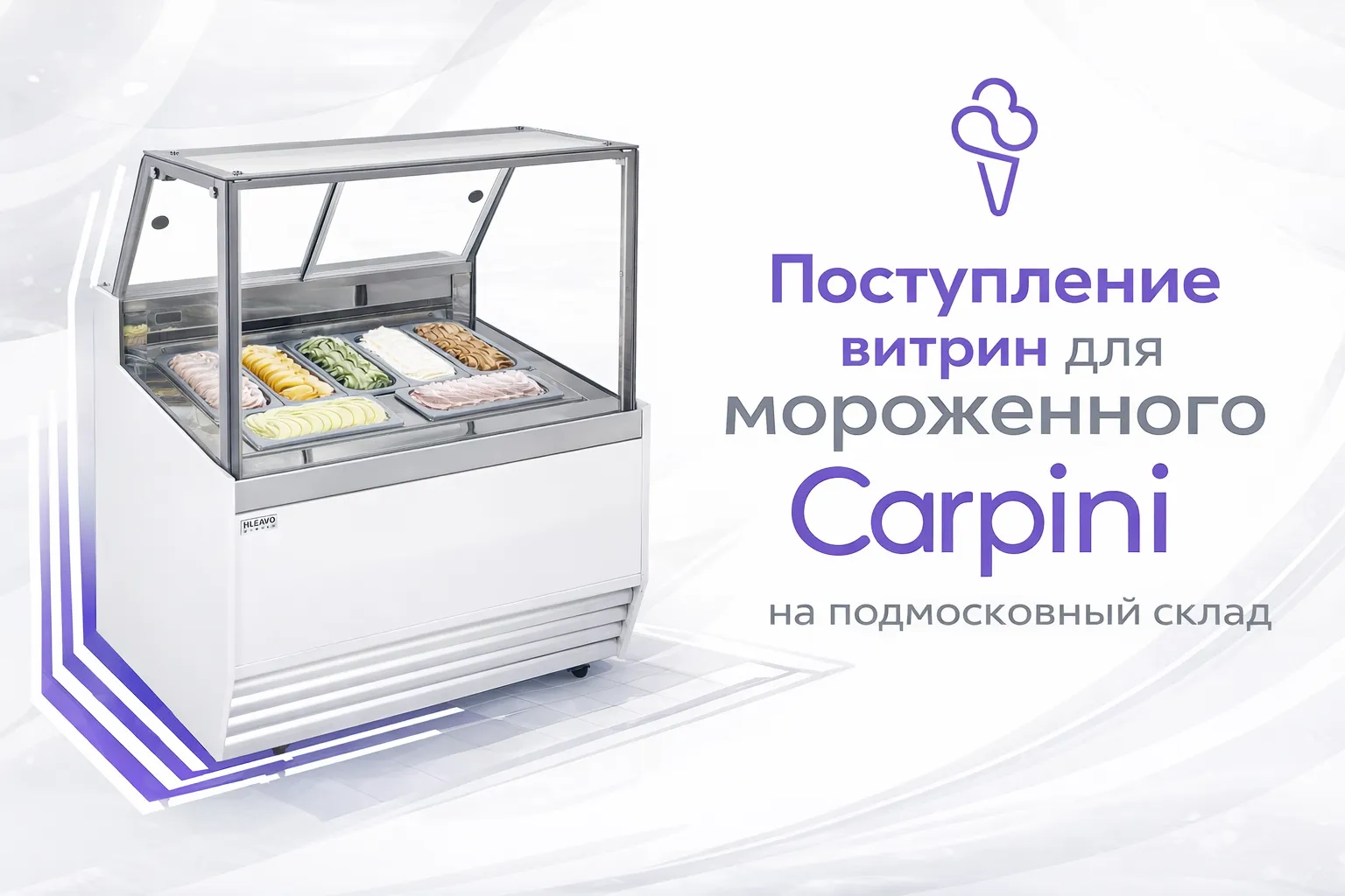 На подмосковный склад поступила партия витрин для мороженого Carpini. В наличии — востребованные модели разной вместимости, также ожидается дополнительная поставка 28 марта.