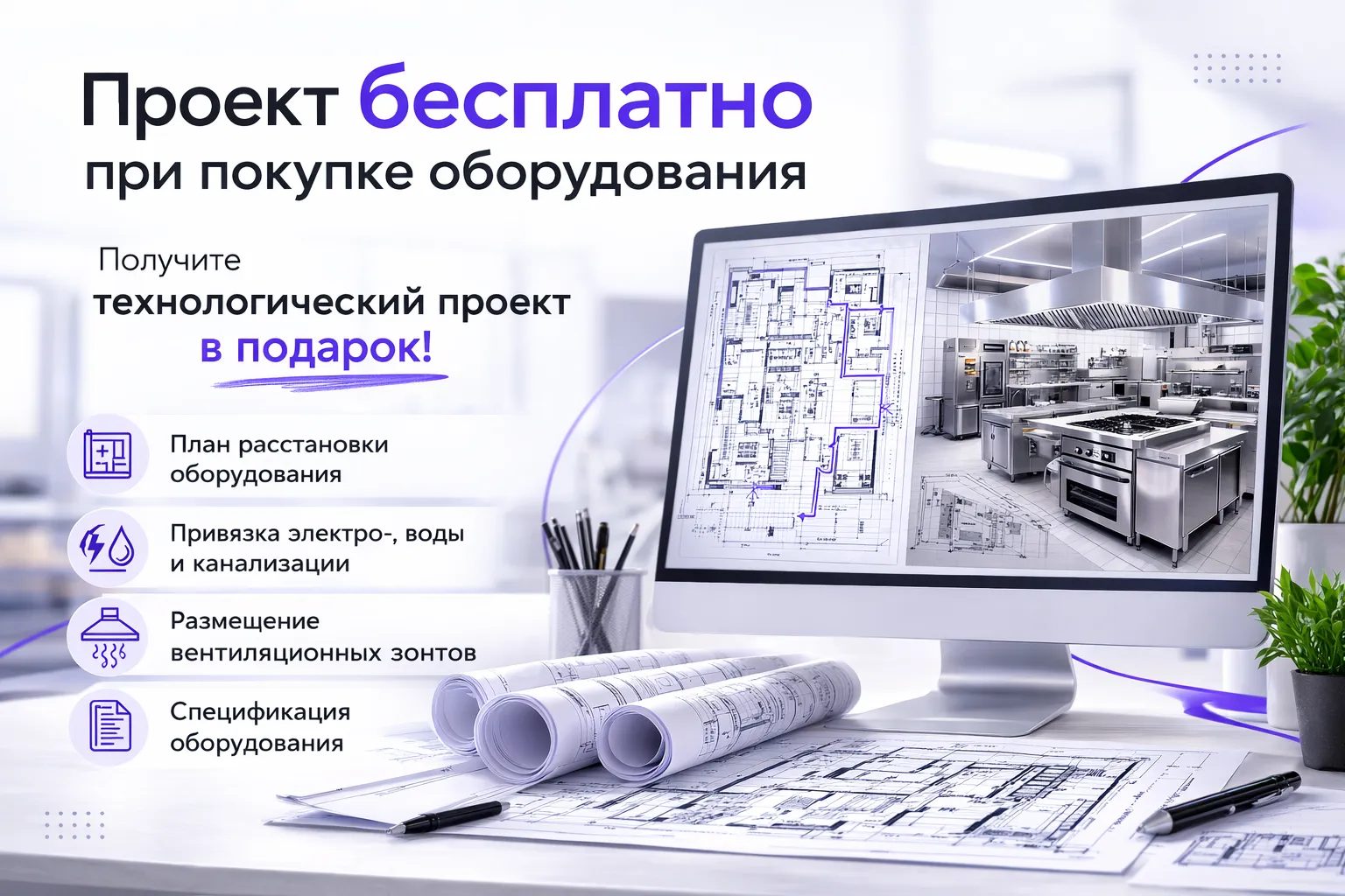 При комплексной покупке профессионального оборудования мы бесплатно разрабатываем технологический проект вашего предприятия общественного питания. Вы получаете продуманную схему размещения оборудования, инженерные привязки и спецификацию — без дополнительных затрат.